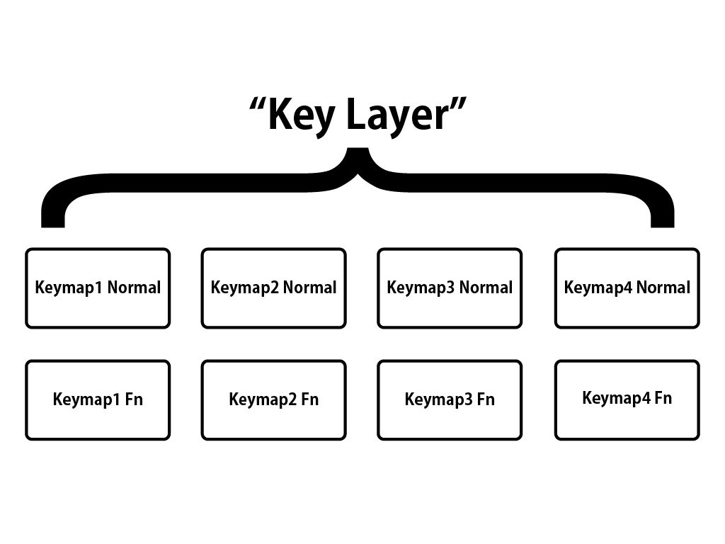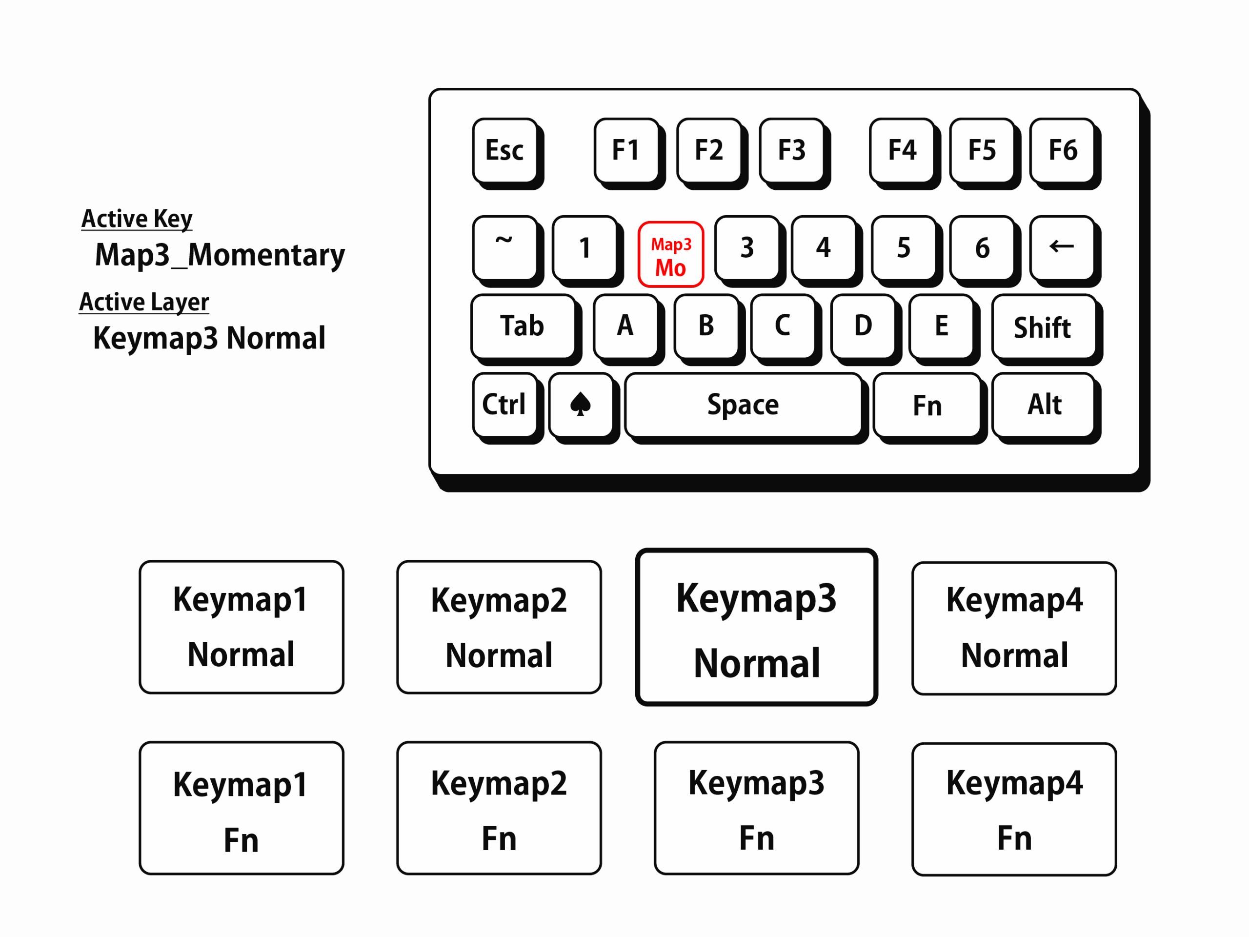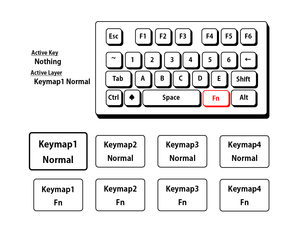 Fnキーを押している間だけ現在のキーマップのFn面に一時的に切り替わり、キーを離すと通常面のキーマップに戻ります。